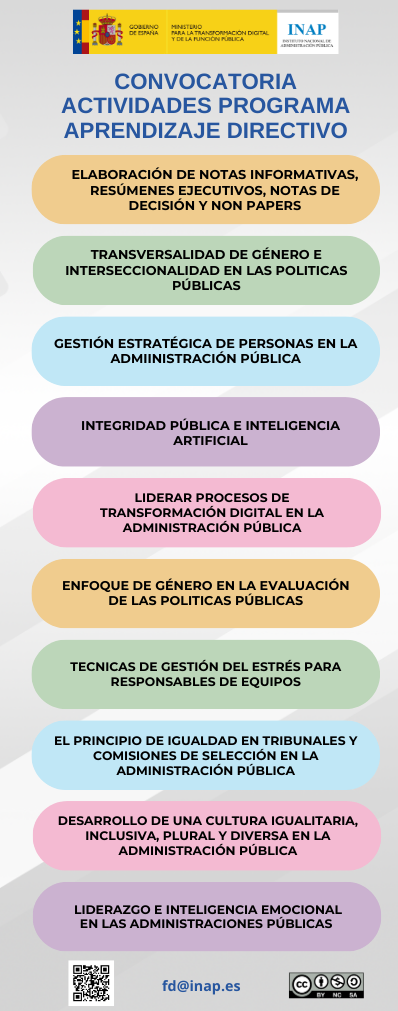 Para más información sobre convocatorias relacionadas con la formación dirigida a personal directivo, predirectivo y técnico puede plantear su consulta en fd@inap.es